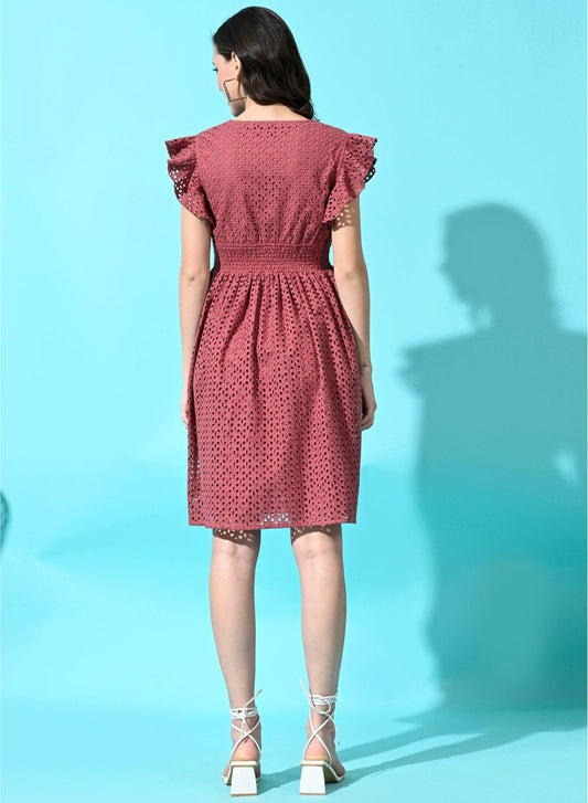 Women's 100% Cotton Schiffli Midi Dress | Smocked Waist, 2 Hidden Pockets - Pink