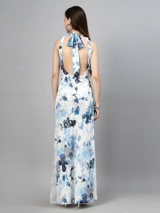 Women's 100% Polyester Back Open Sleeveless Printed Maxi Dress - Blue