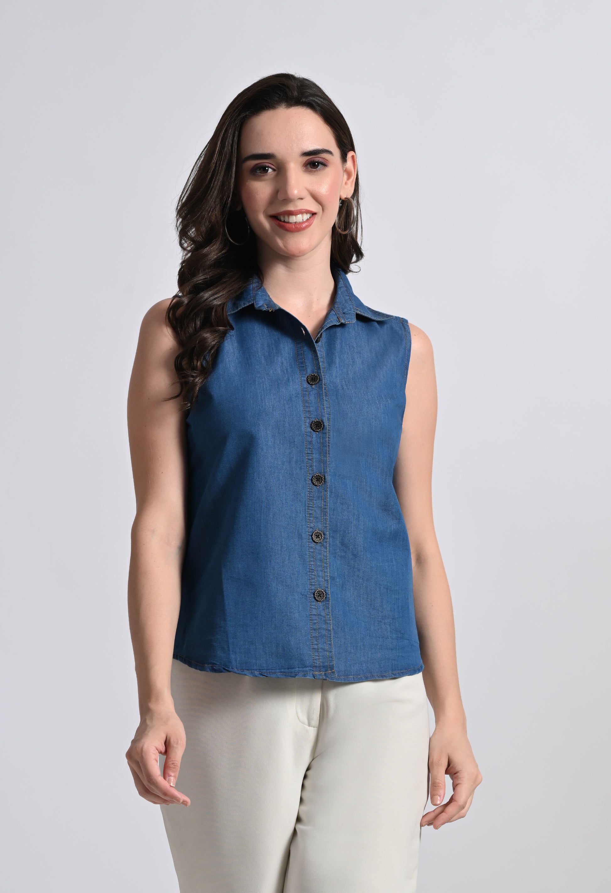 Women's Sleeveless Denim Button Down Cotton Top